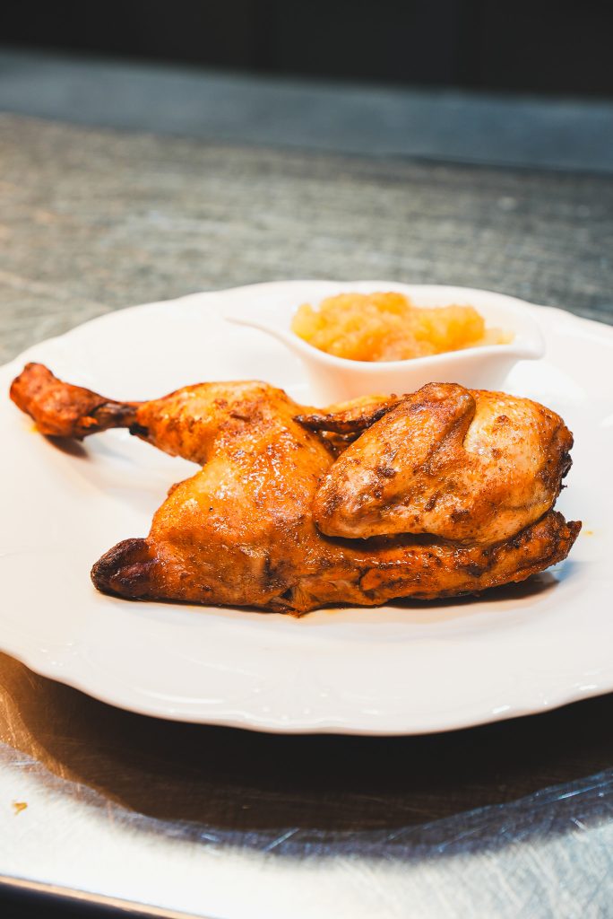• Halve haan met frietjes en appelcompote
